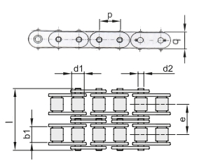 Цепь роликовая 06B-2, EMT, двухрядная, европейского стандарта (DIN 8187 – ISO 606), с шагом цепи 9,525 мм, изготовлена из высопрочной закаленной стали. Имеет ширину ролика 5,72 мм, диаметр ролика 6,35 мм. Цепь поставляется в упаковке отрезками по 5 м.
